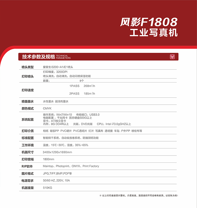 这款设备搭载配备8个爱普生I3200喷头,生产模式可以达到268㎡/h,户内户外广告订单皆可轻松完成。